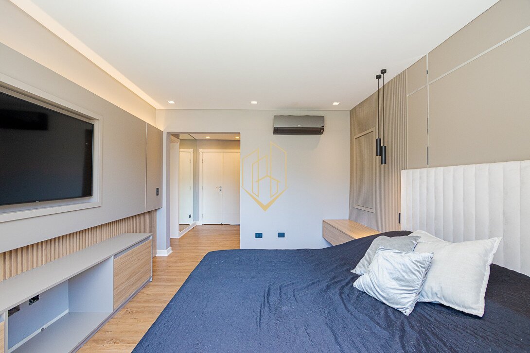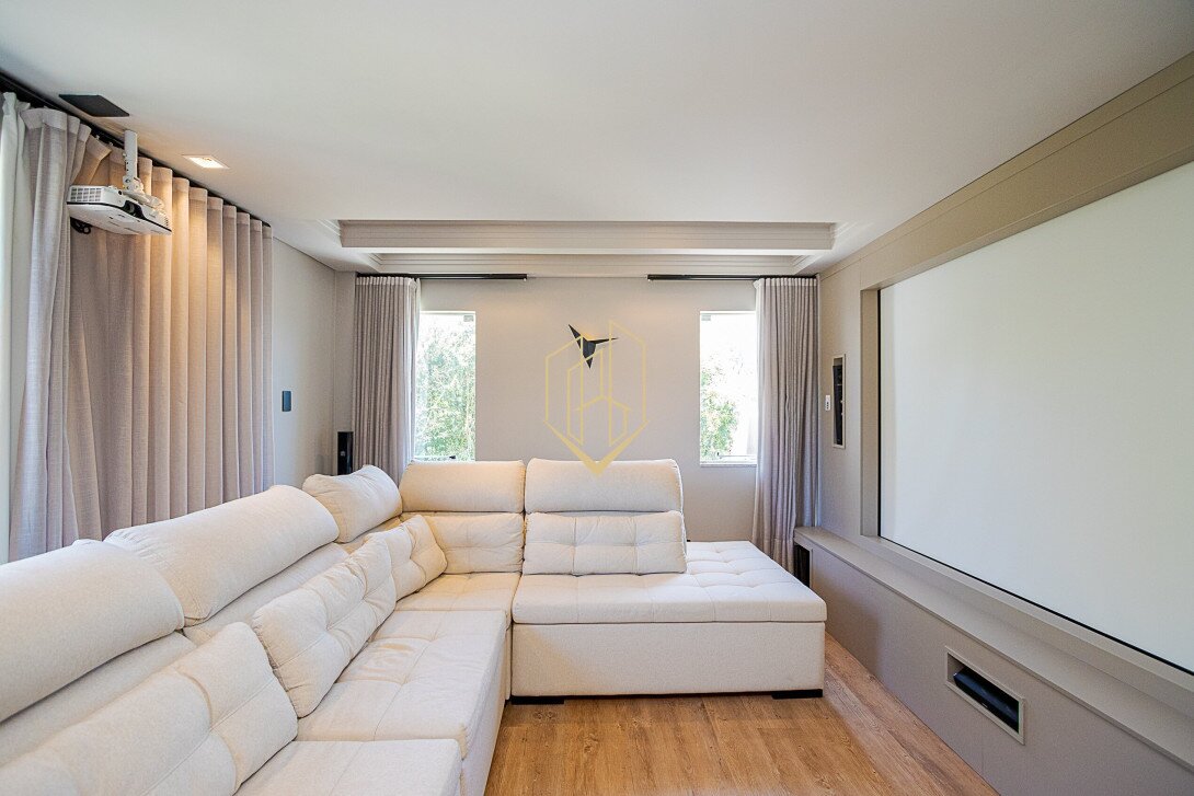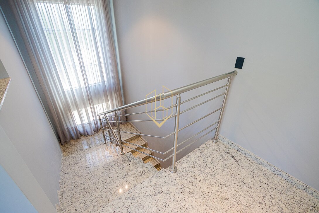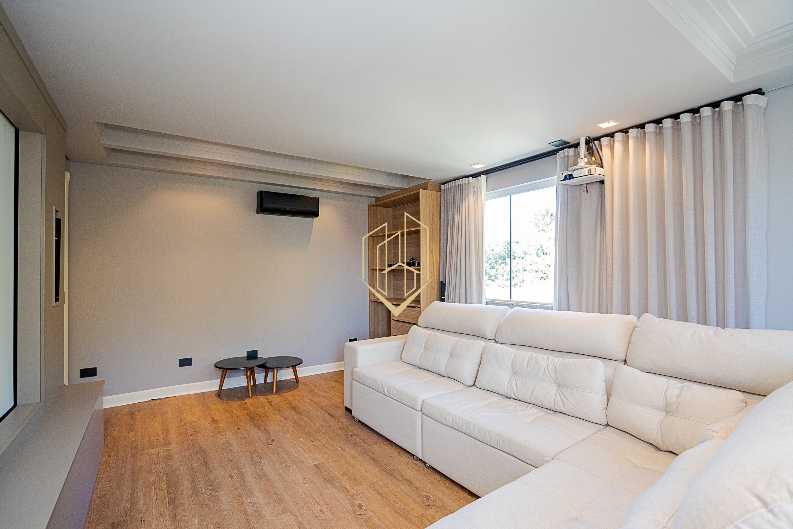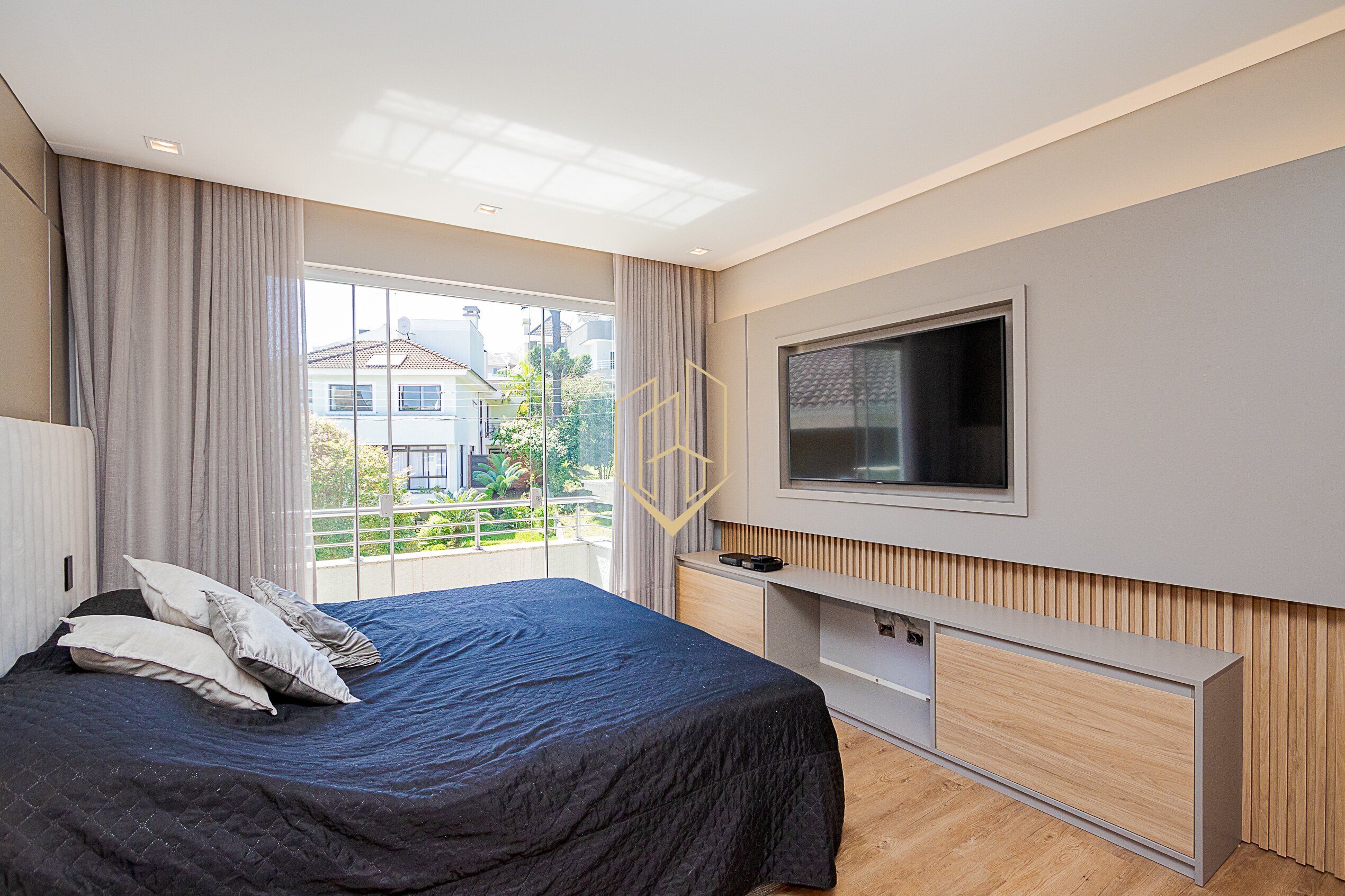 Já no piso superior temos a suíte toda climatizada, com closet, banheira de imersão e uma sacada charmosa. Os demais quartos contam com armários planejados e climatização. Temos ainda neste piso o banheiro social e uma sala de cinema encantadora.