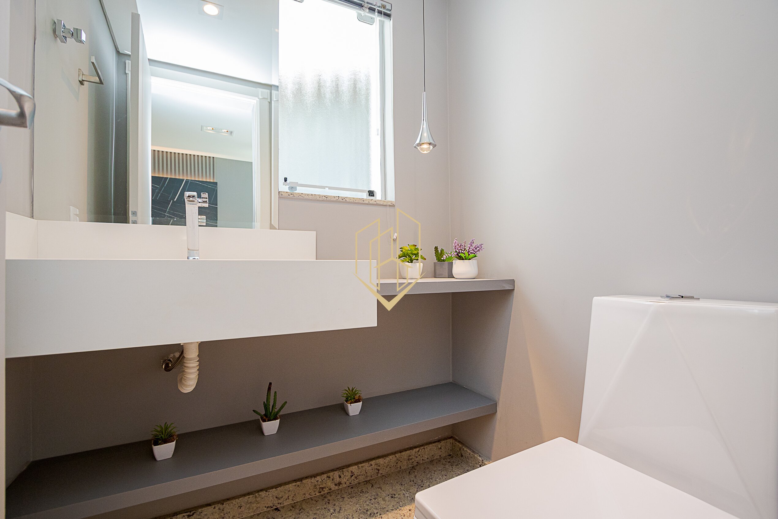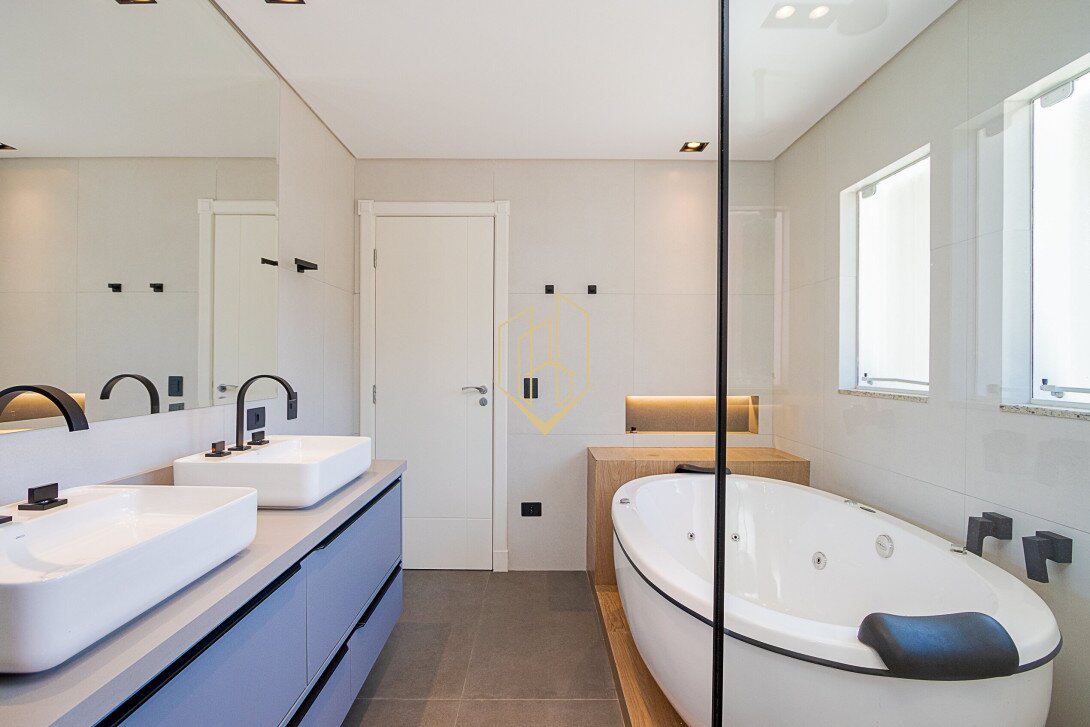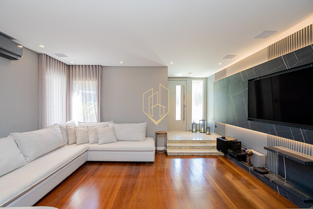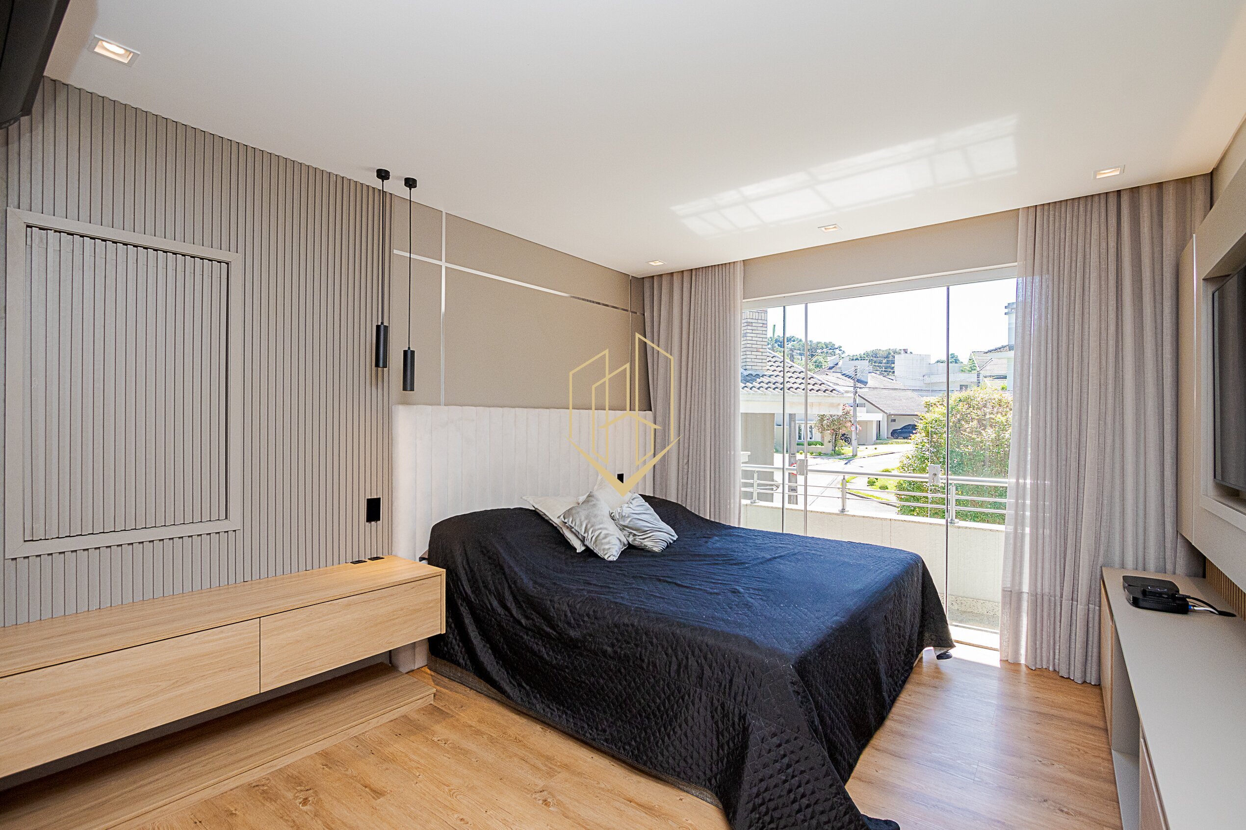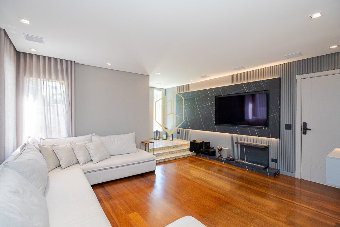 Já no piso superior temos a suíte toda climatizada, com closet, banheira de imersão e uma sacada charmosa. Os demais quartos contam com armários planejados e climatização. Temos ainda neste piso o banheiro social e uma sala de cinema encantadora.