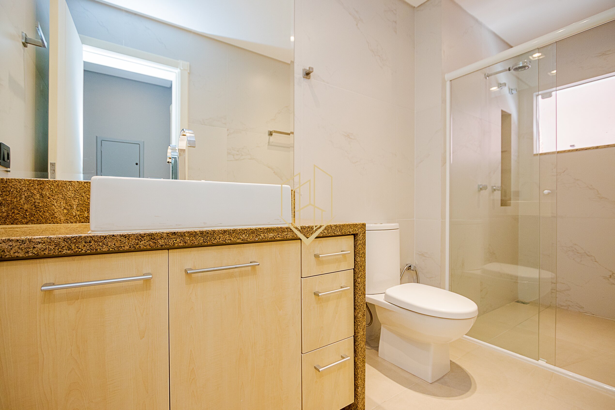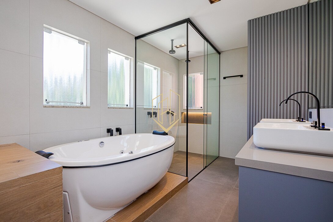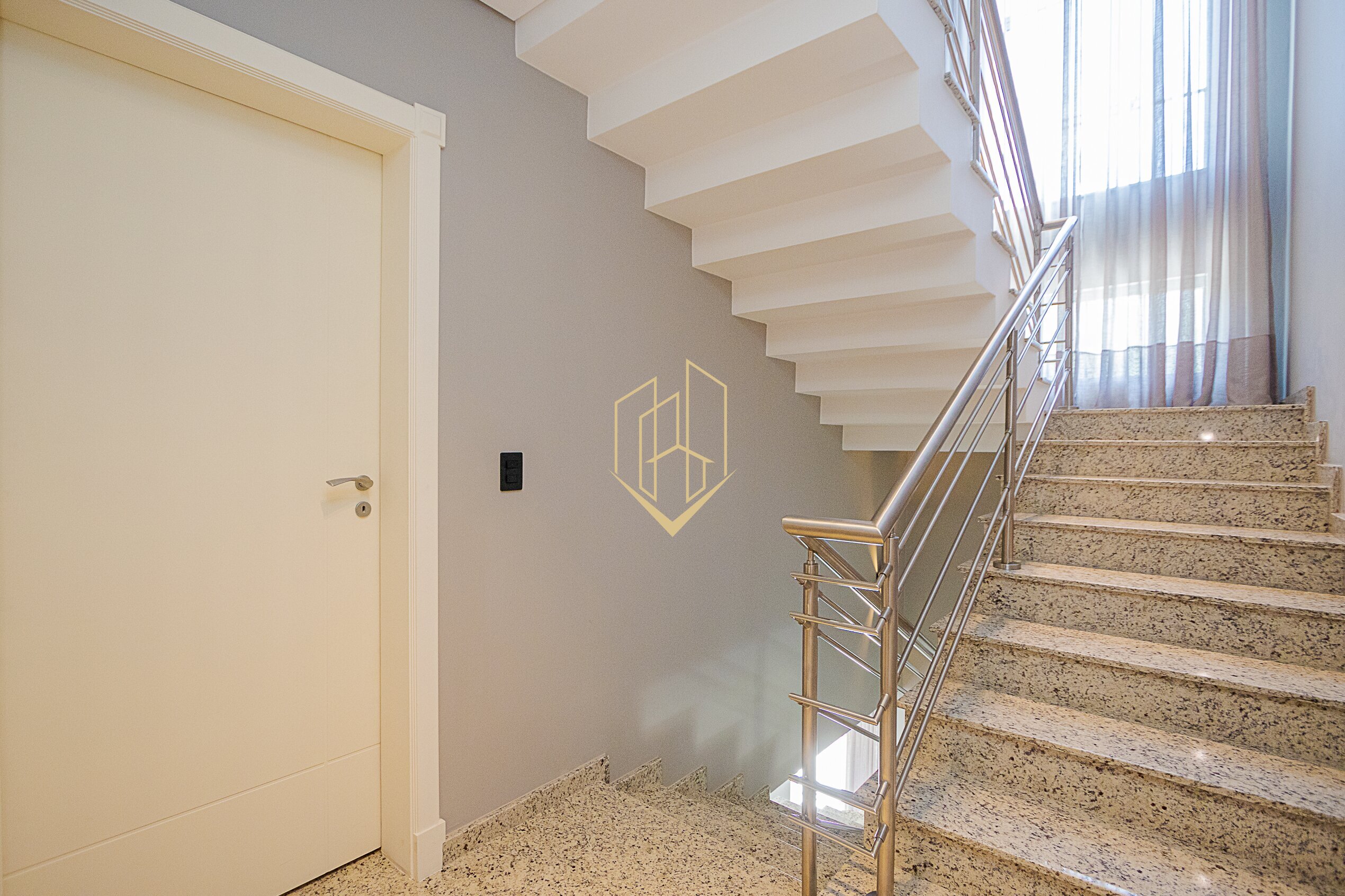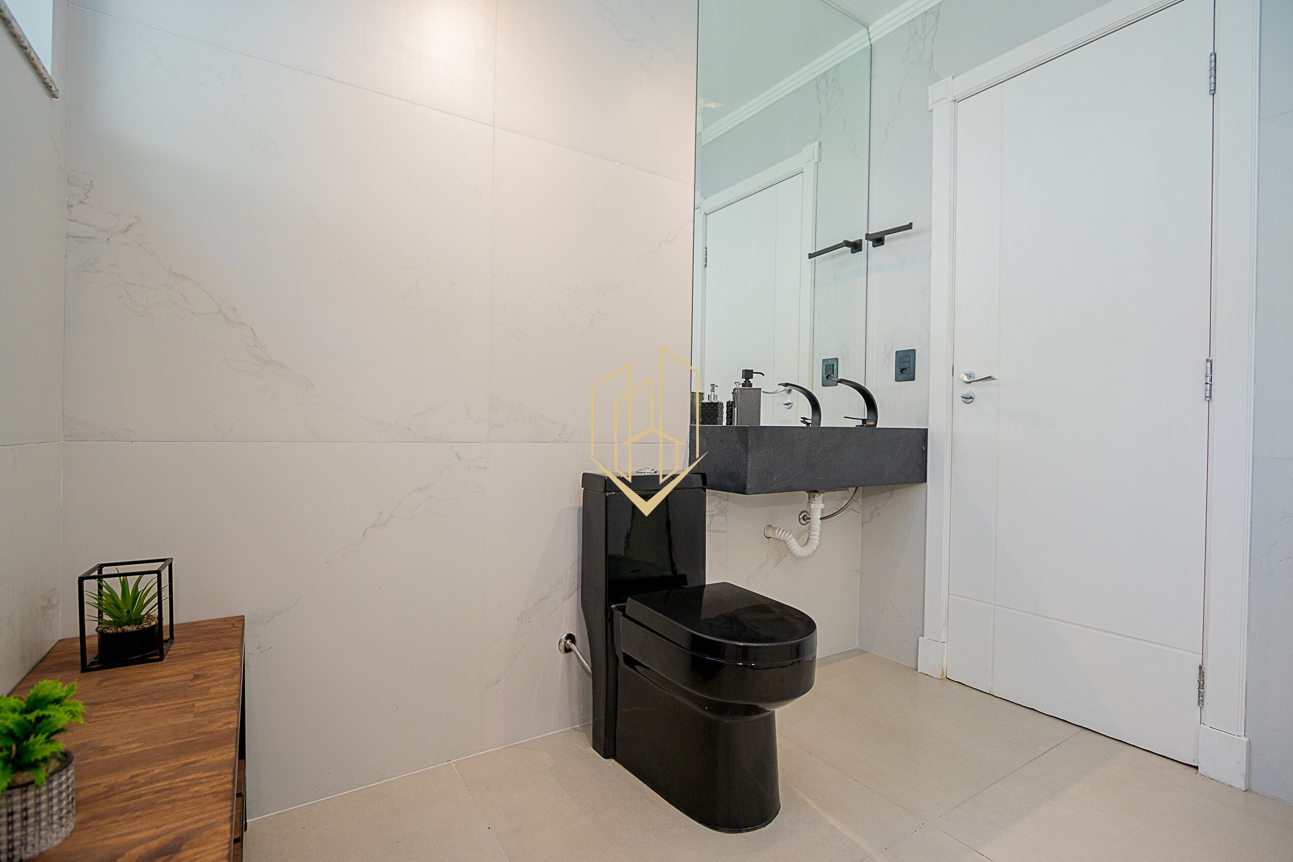 Já no piso superior temos a suíte toda climatizada, com closet, banheira de imersão e uma sacada charmosa. Os demais quartos contam com armários planejados e climatização. Temos ainda neste piso o banheiro social e uma sala de cinema encantadora.