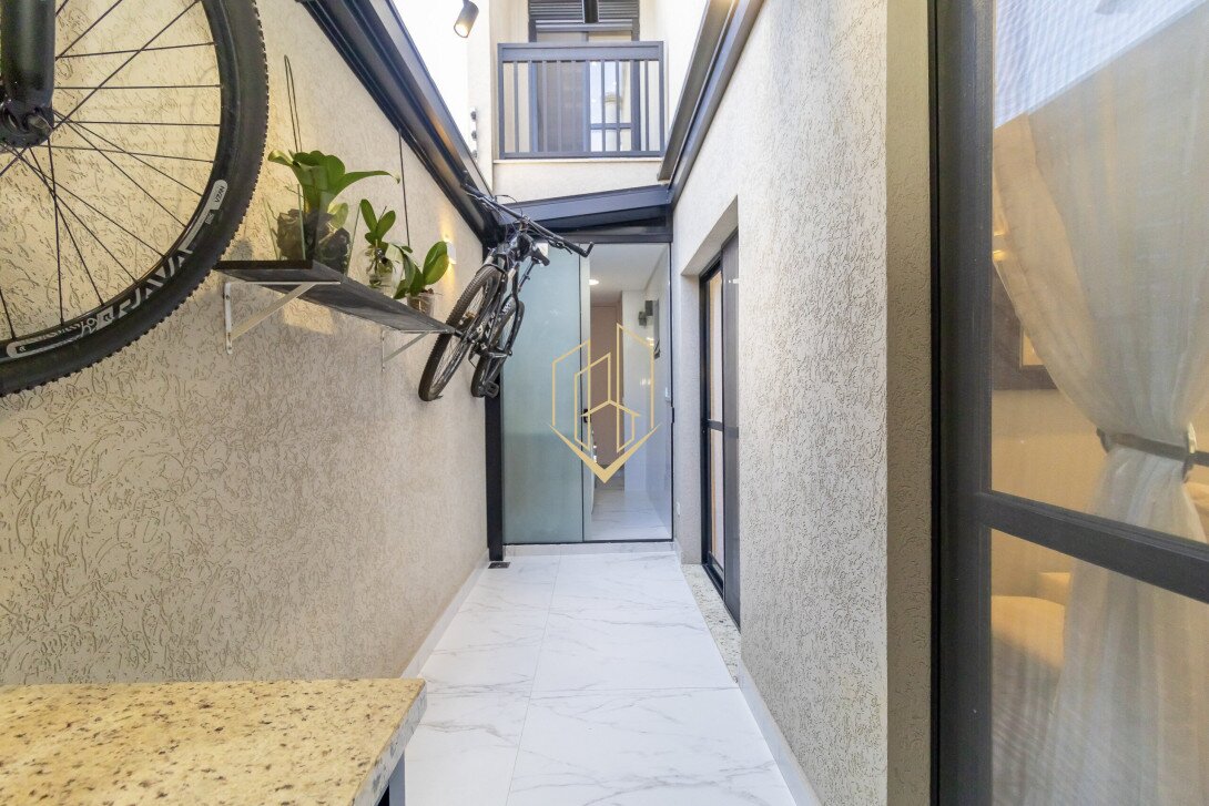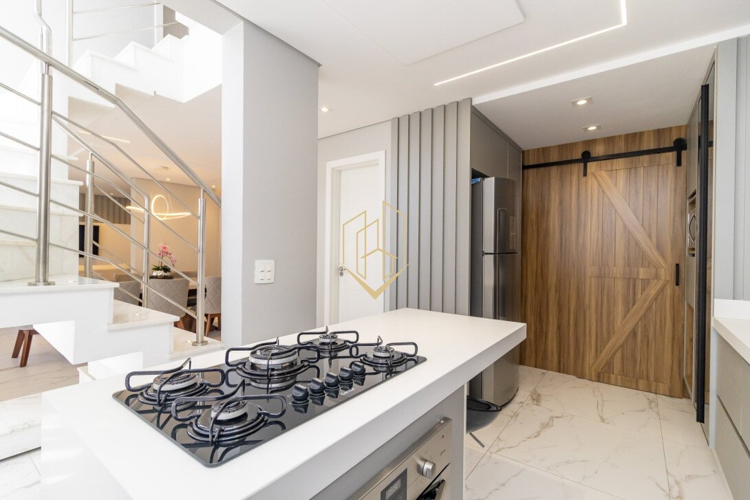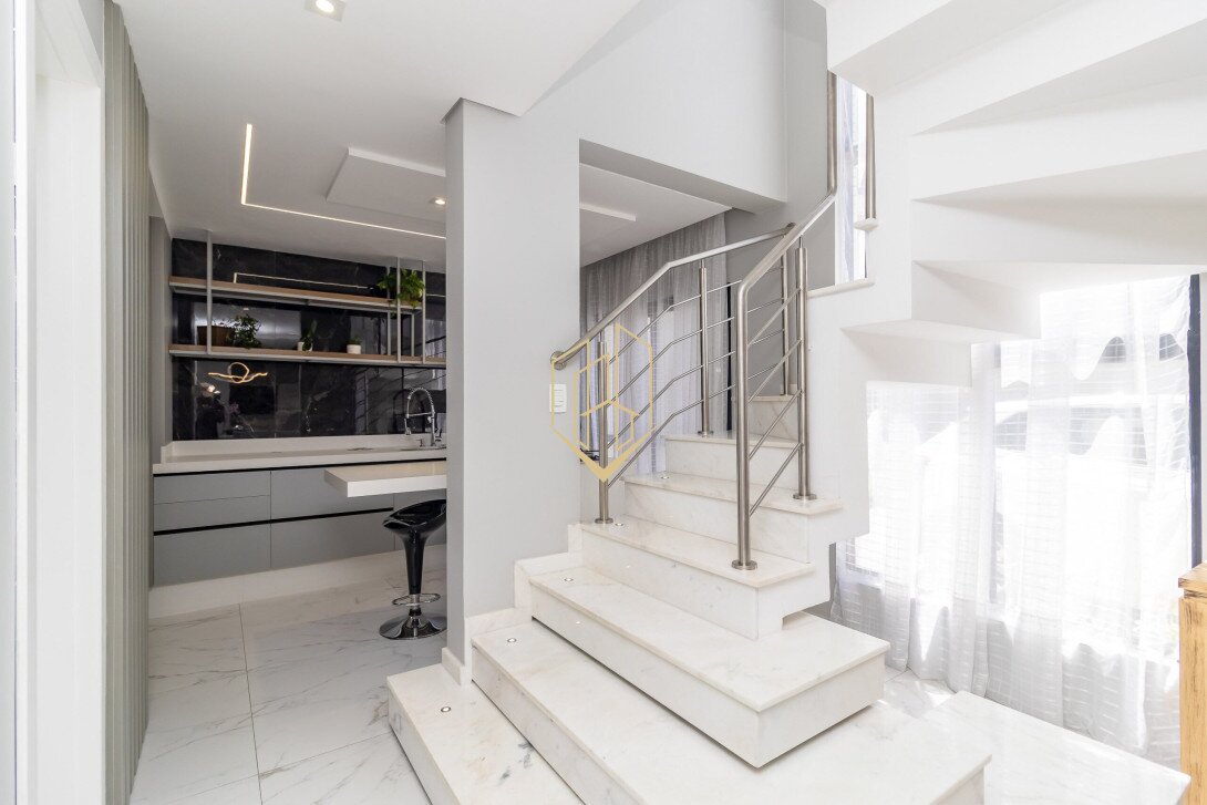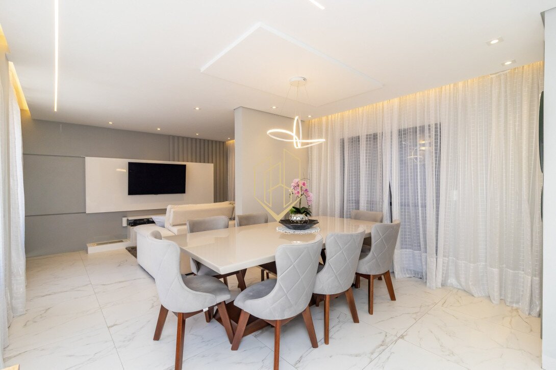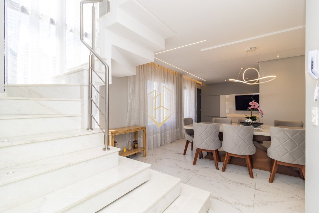 Contendo 174,47 m² de área privativa, distribuídos em três pavimentos, face norte com ótima insolação e ventilação natural, móveis planejados na cozinha e suíte, piso porcalenato na sala, cozinha, área de serviço e espaço gourmet, madeira maciça nos dormitórios, teto rebaixado em gesso com projeto luminotécnico, infra para ar condicionado na sala e nos dormitórios, persianas automatizadas, fachada com tijolinho a vista e pintura em grafiato.