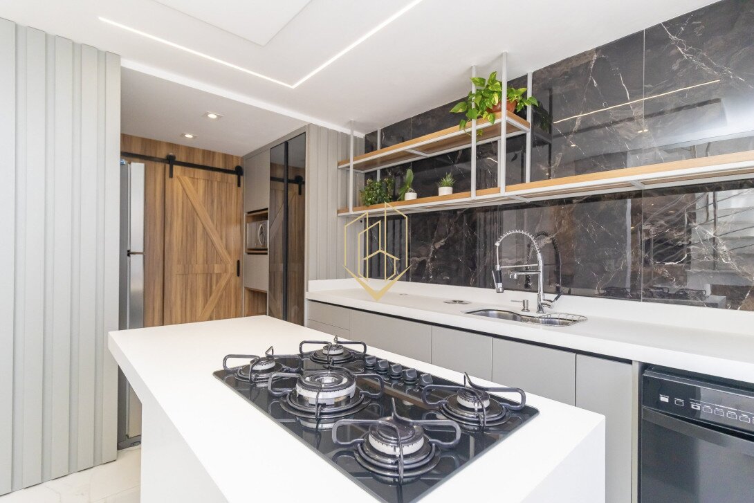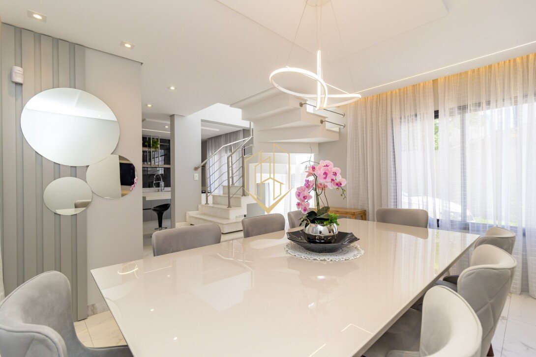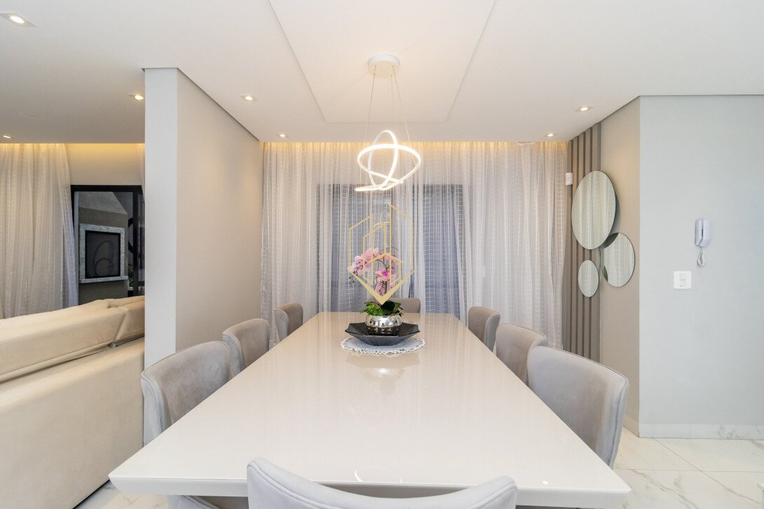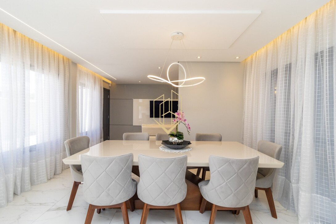 No pavimento térreo temos a sala de estar com lareira a gás, sala de jantar, lavabo, cozinha com ilha, despensa, área de serviço e espaço gourmet com teto retrátil.