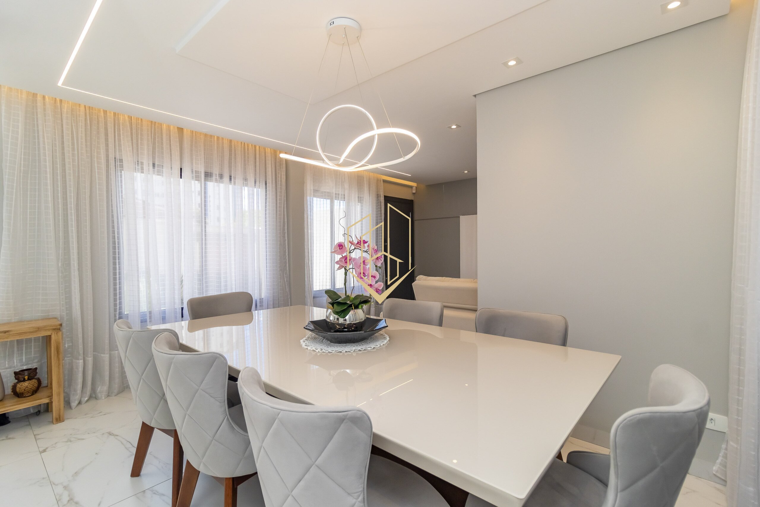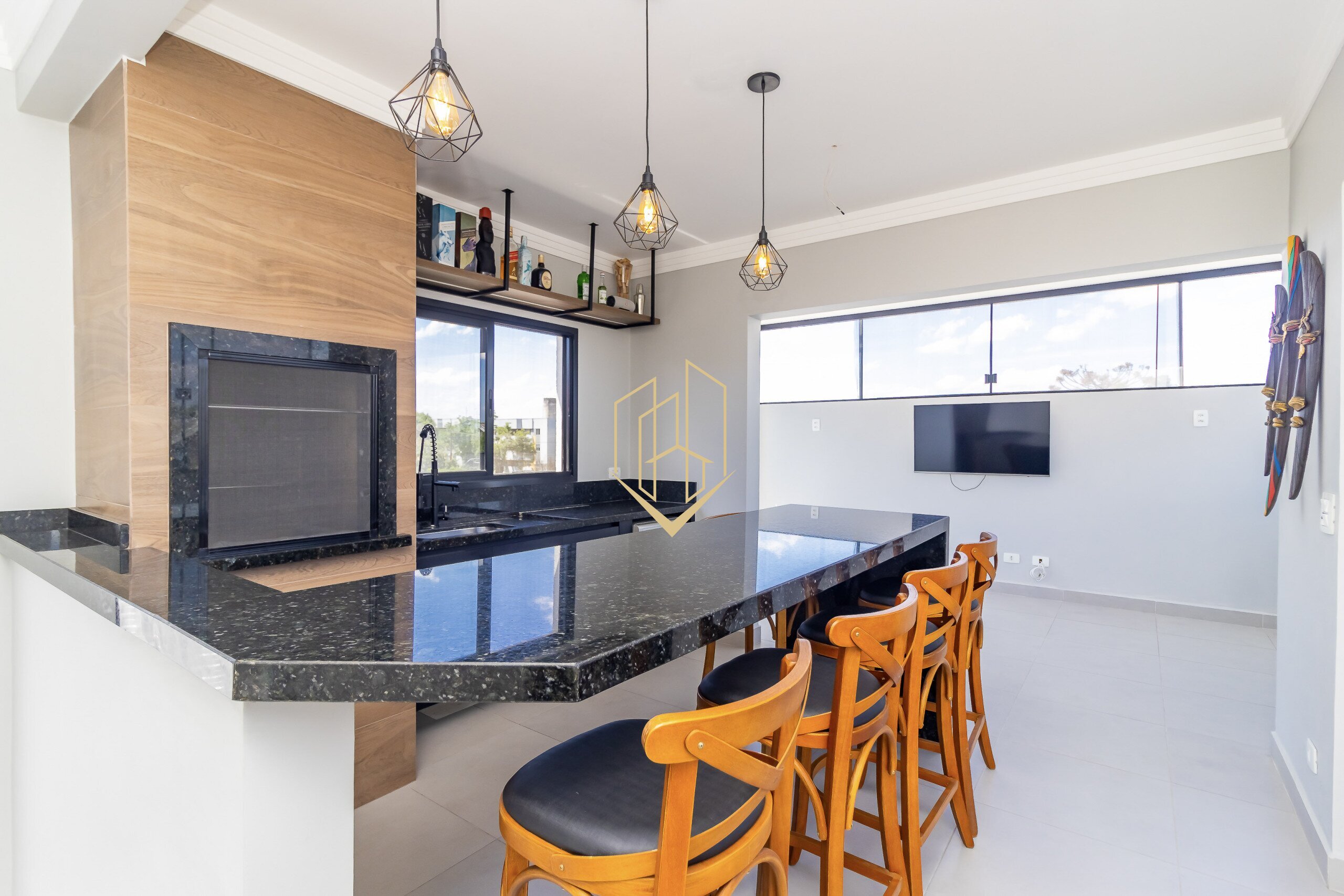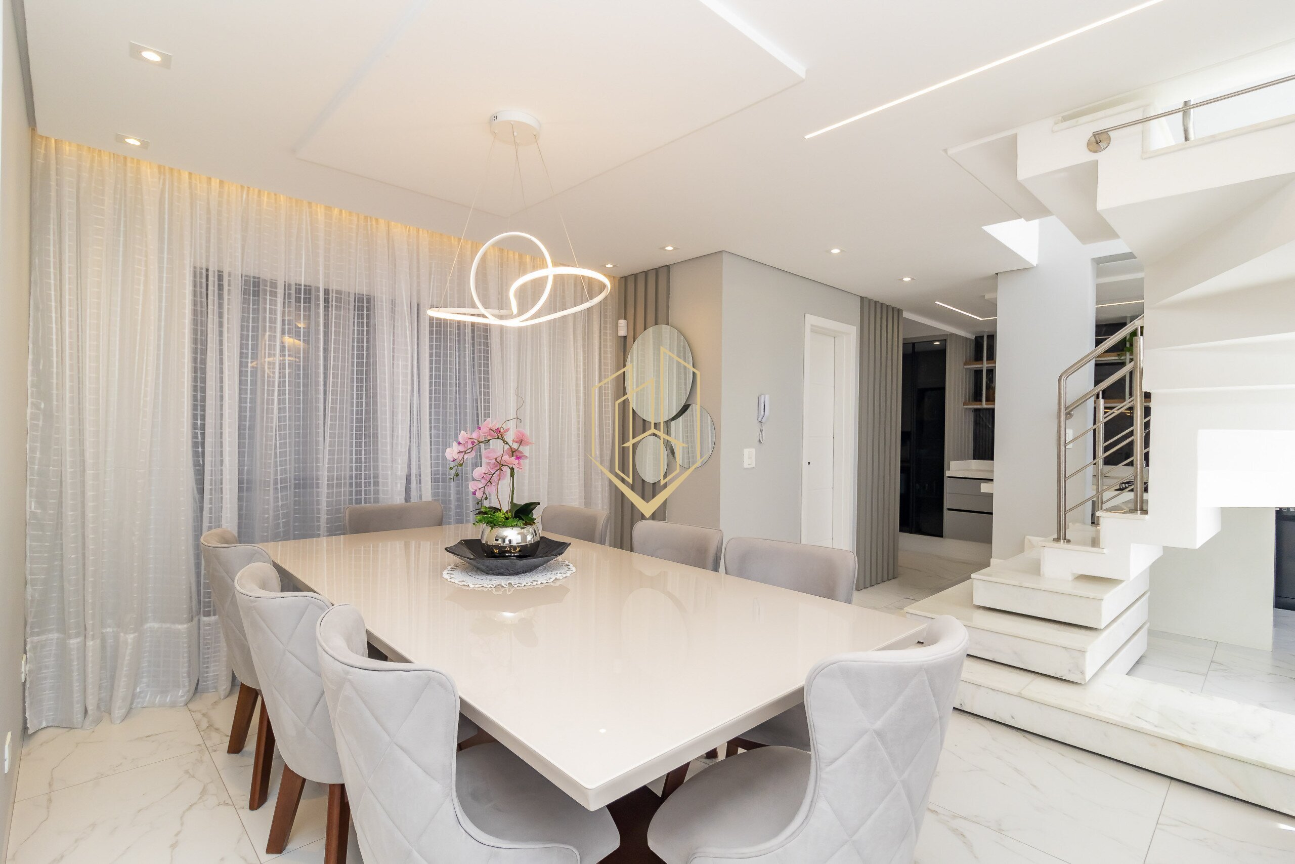 No pavimento térreo temos a sala de estar com lareira a gás, sala de jantar, lavabo, cozinha com ilha, despensa, área de serviço e espaço gourmet com teto retrátil.
