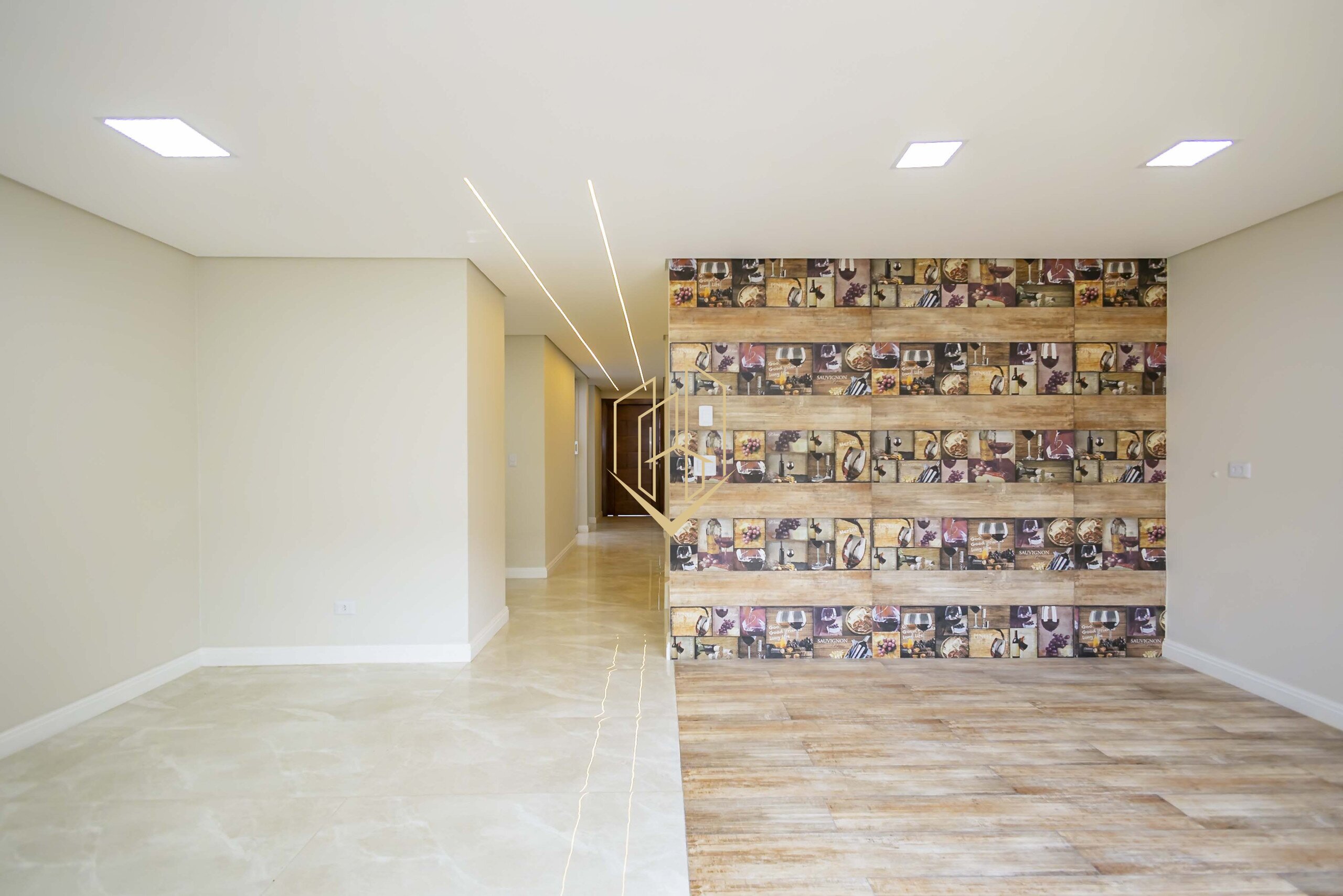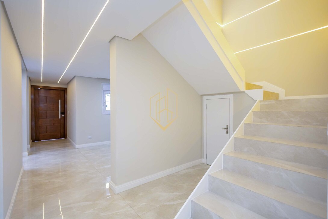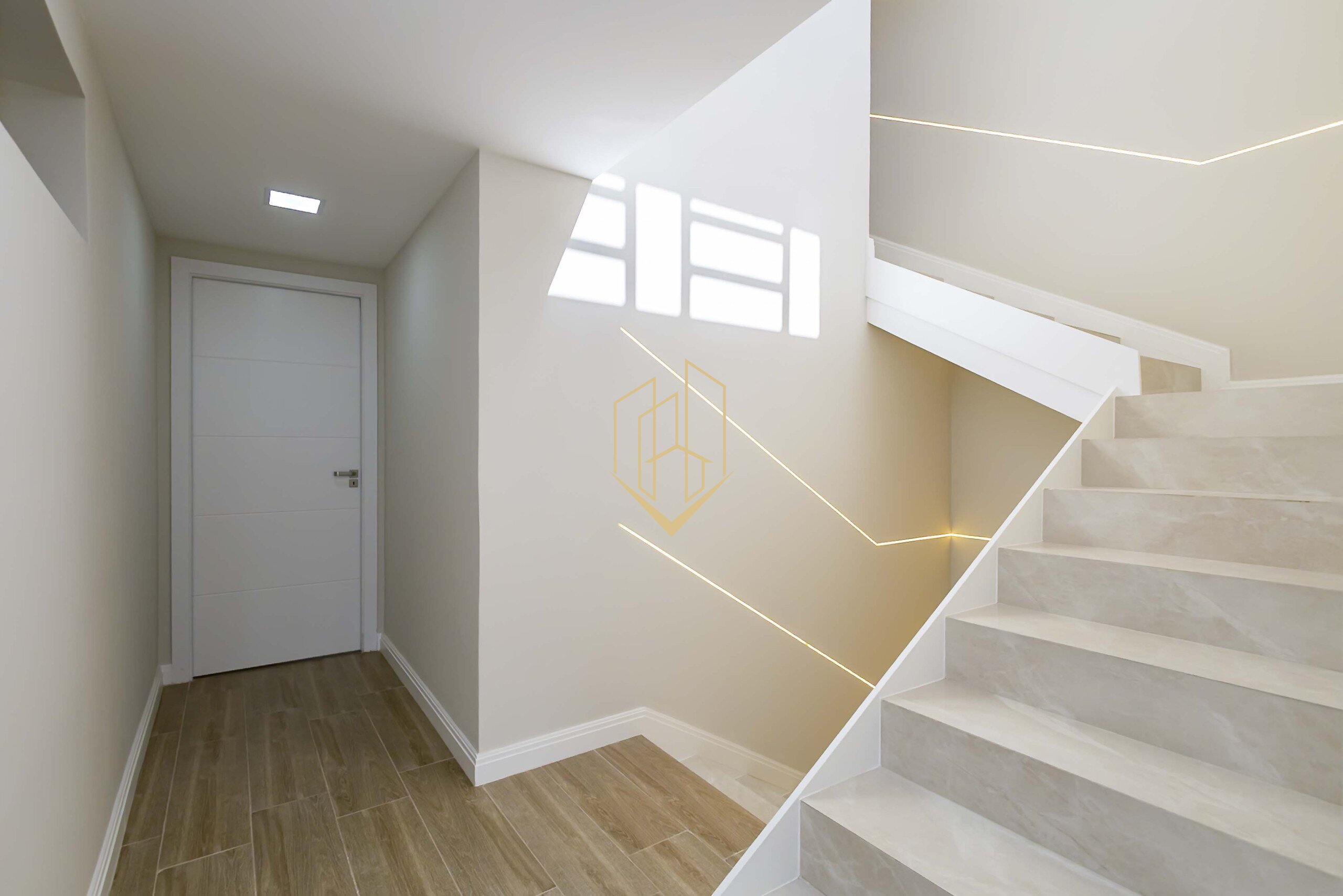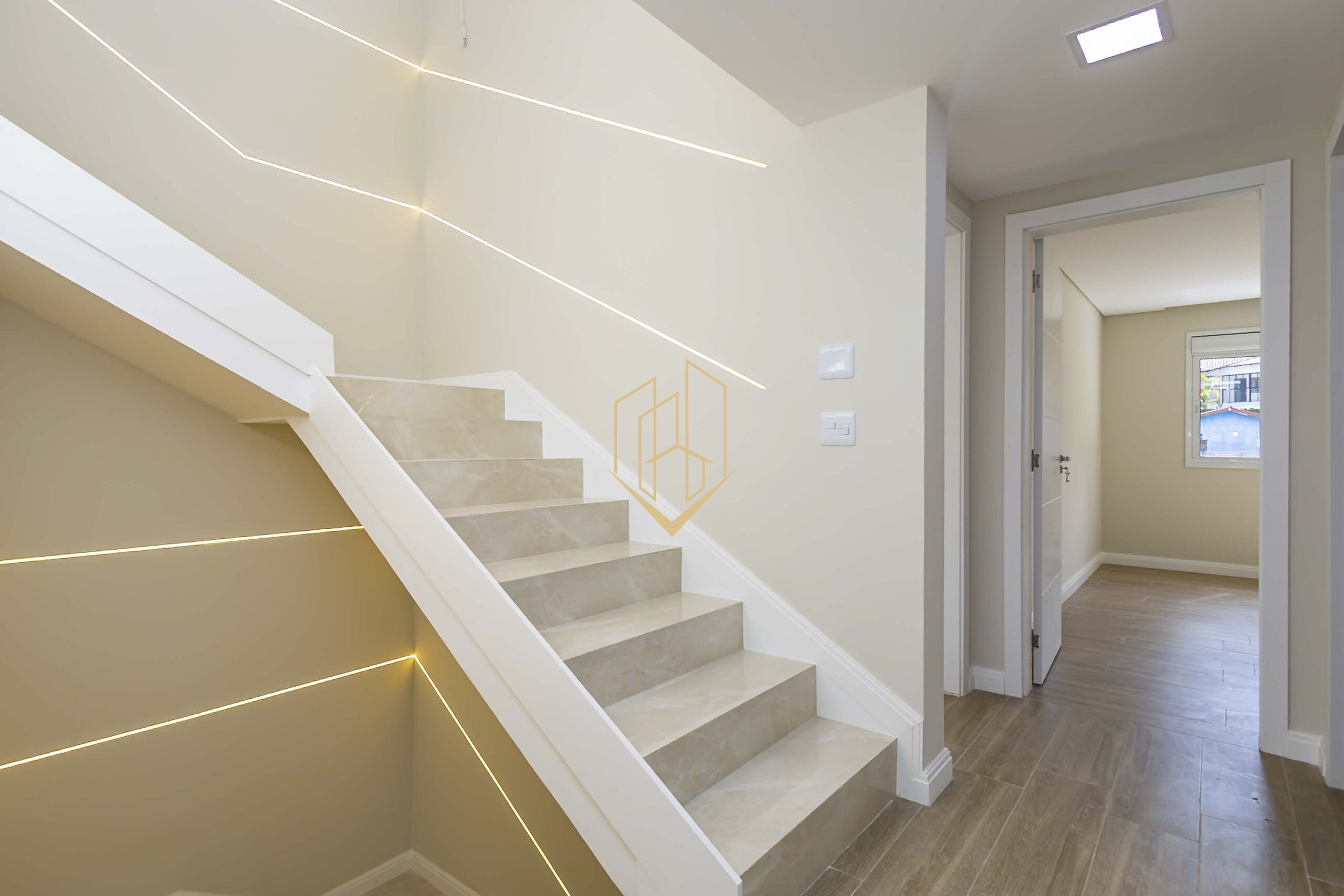 Contendo 223,28 m² de área privativa, distribuídos em três pavimentos, face sul/norte com ótima insolação e ventilação natural, piso porcelanato na sala, cozinha, área de serviço e dormitórios, teto rebaixado em gesso com projeto luminotécnico, infraestrutura para ar condicionado na sala e nos dormitórios, persianas automatizadas, escada em porcelanato, toda área externa com pintura projetada, espaço para instalação de elevador.