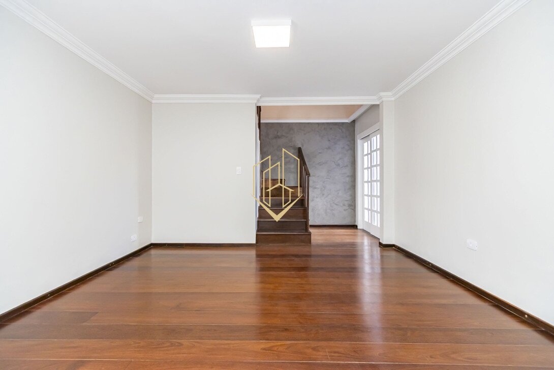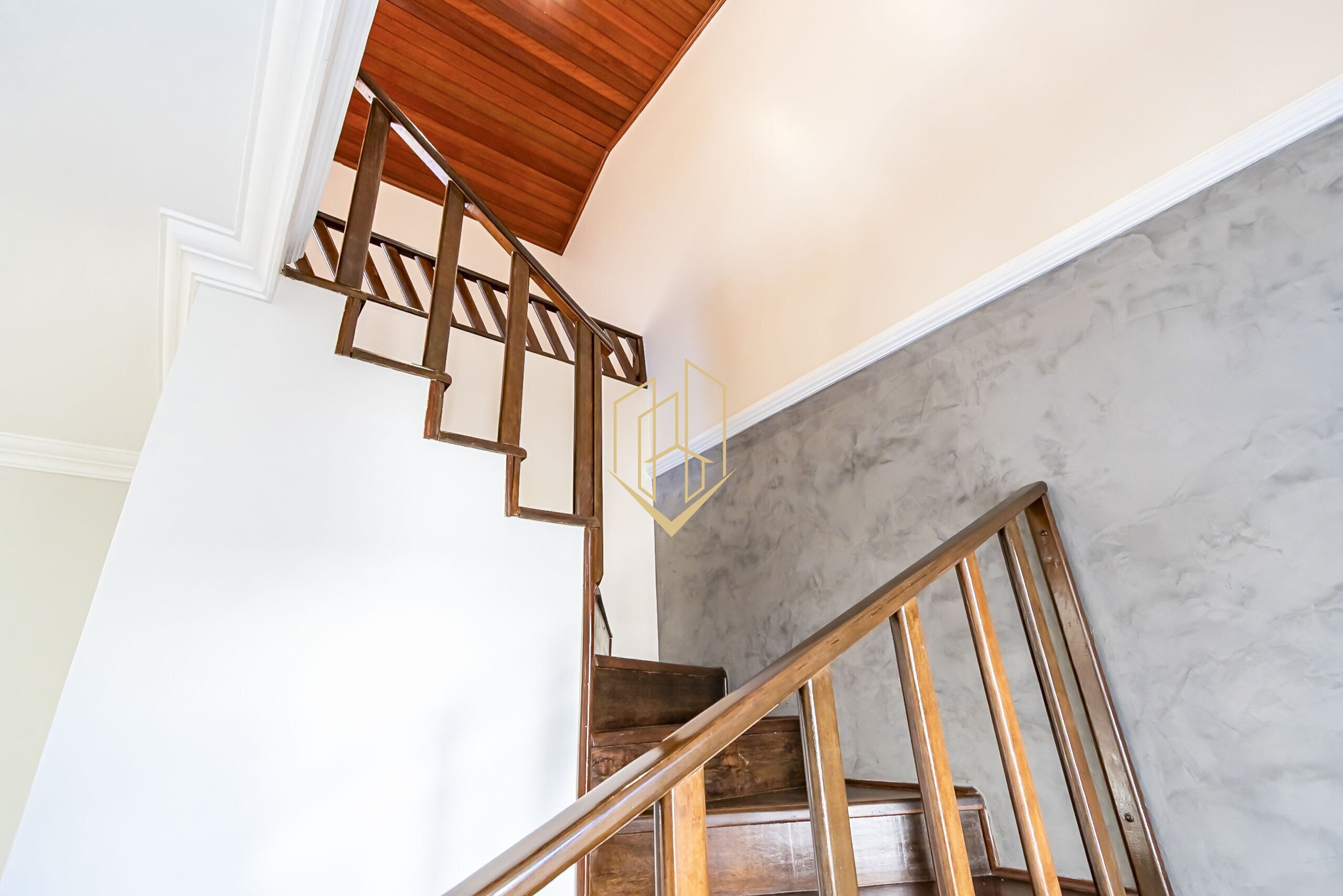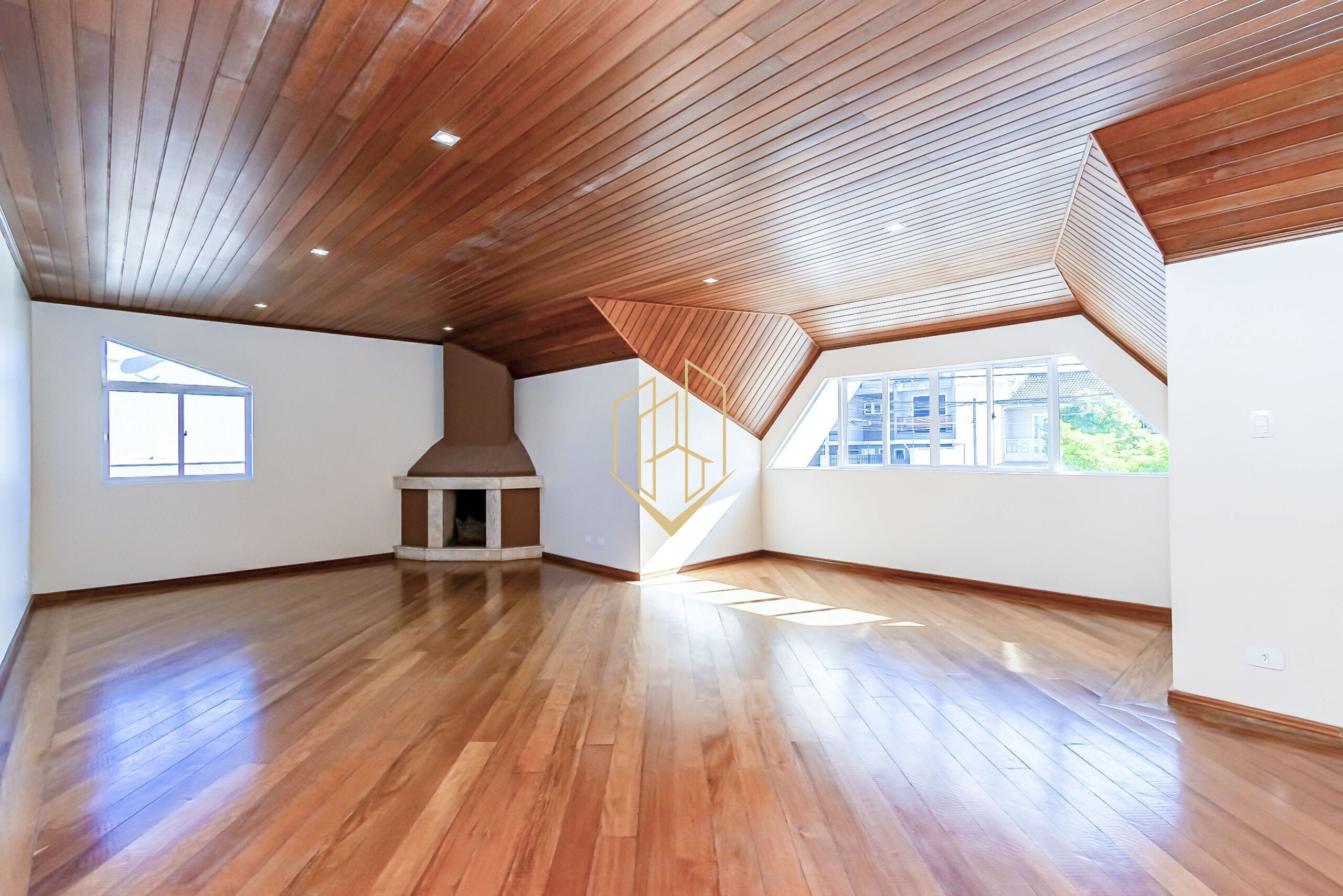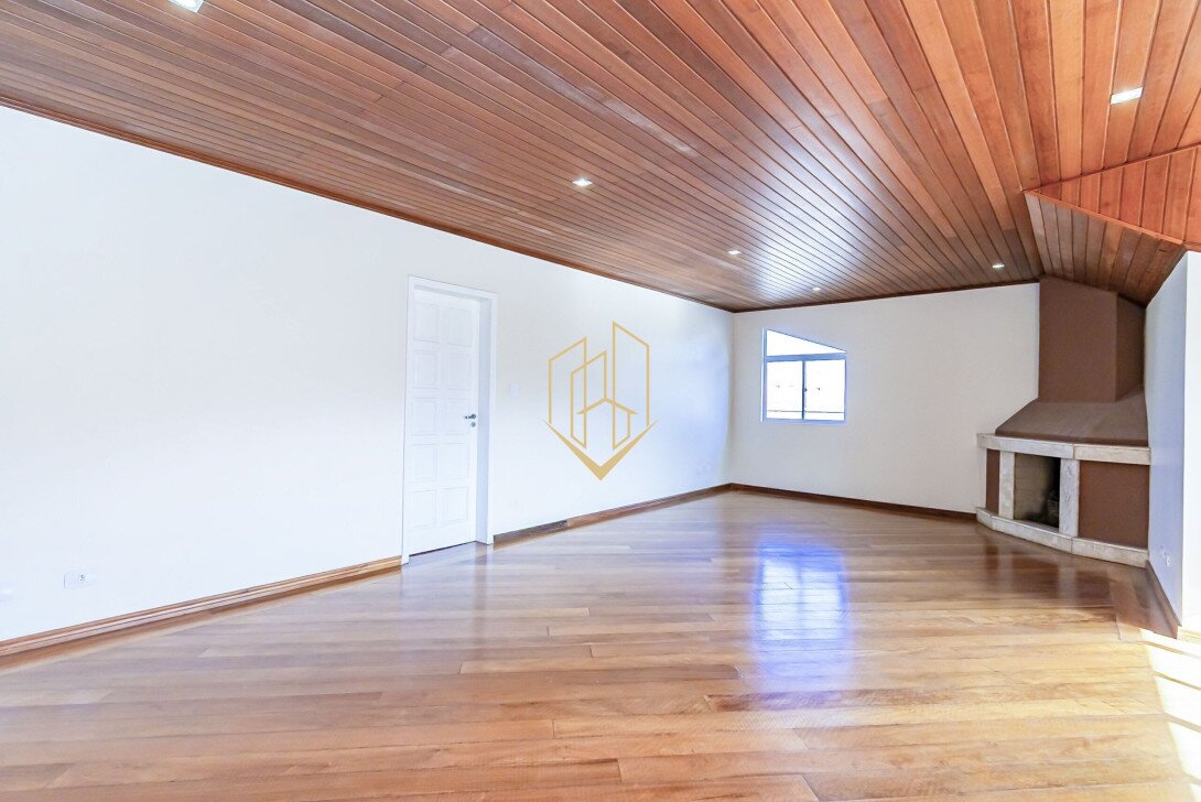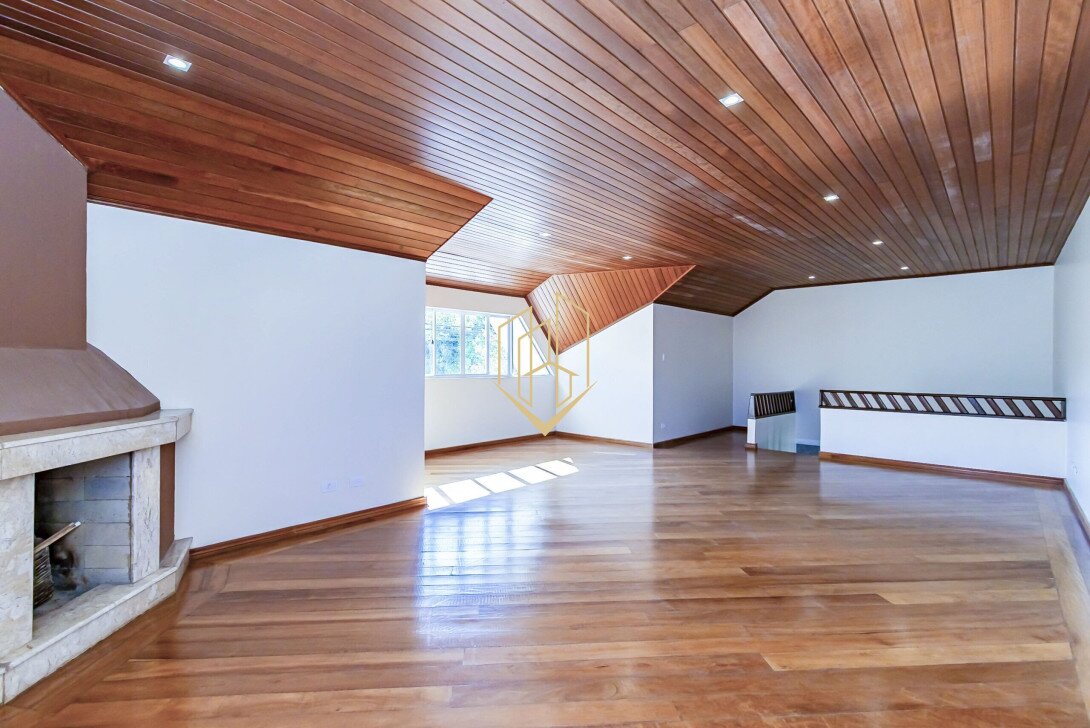 No pavimento superior temos uma sala para dois ambientes com lareira e piso em madeira, e uma ampla suíte com espaço para closet, sacada e banheiro com box até o teto.
