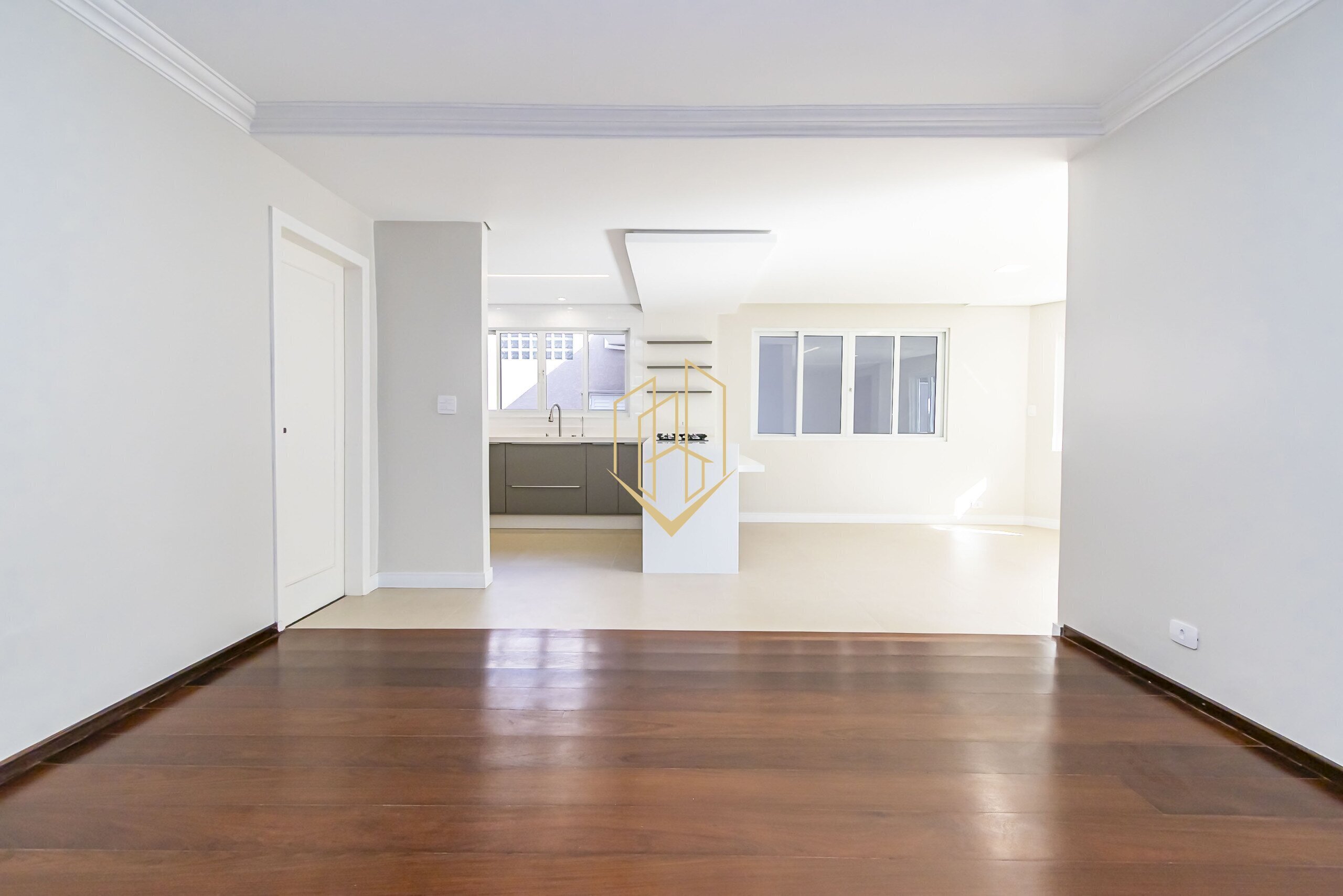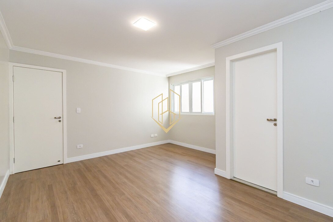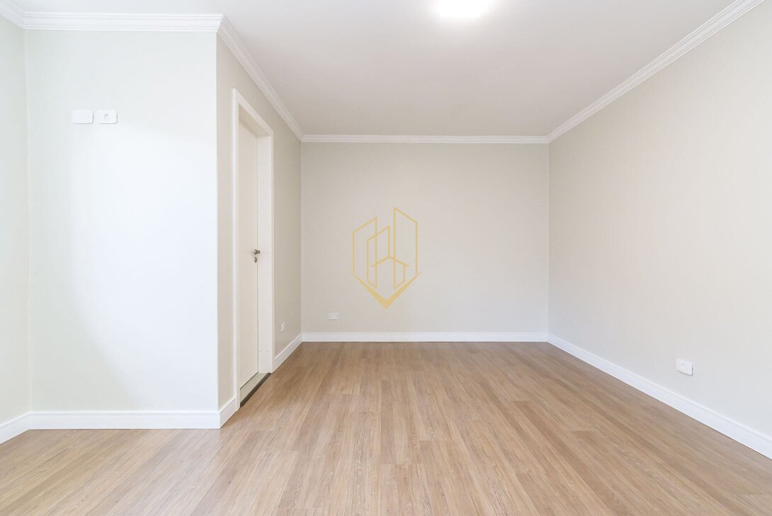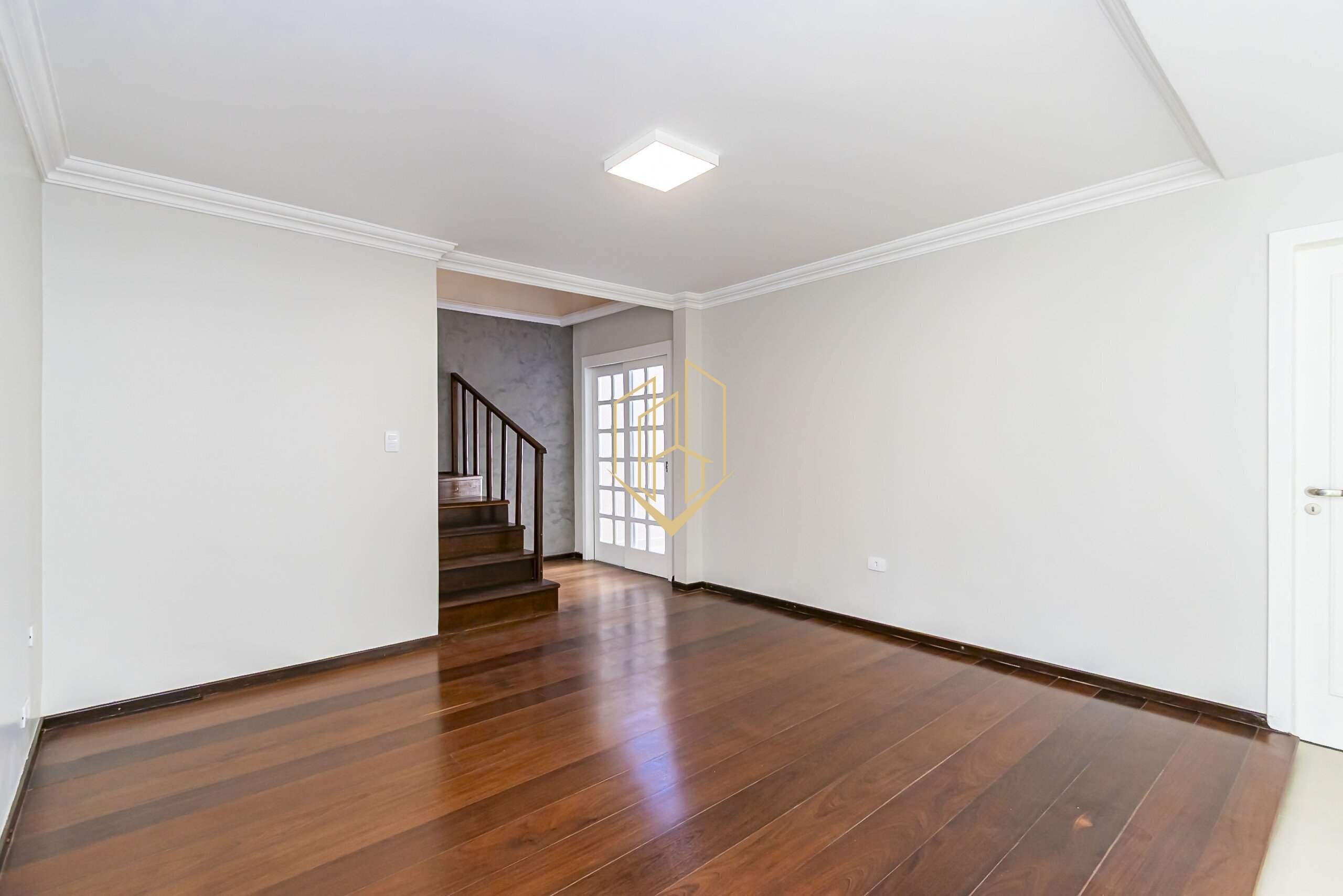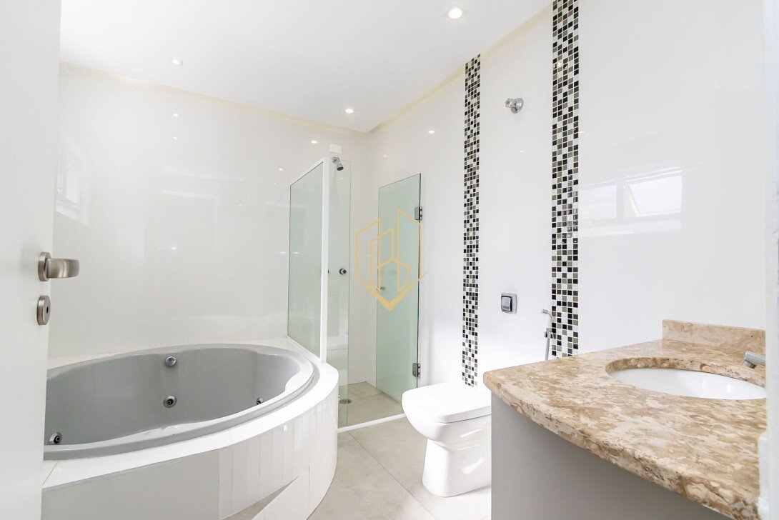 No pavimento superior temos uma sala para dois ambientes com lareira e piso em madeira, e uma ampla suíte com espaço para closet, sacada e banheiro com box até o teto.